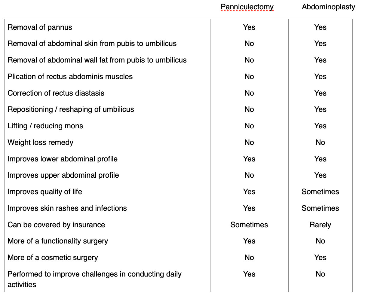 Panniculectomy and abdominoplasty procedures are two separate surgical interventions aimed at addressing issues related to excess abdominal tissue. However, they serve different objectives and are performed under different clinical indications. Comprehending the distinctive features of each surgical procedure is essential for individuals contemplating abdominal surgery.