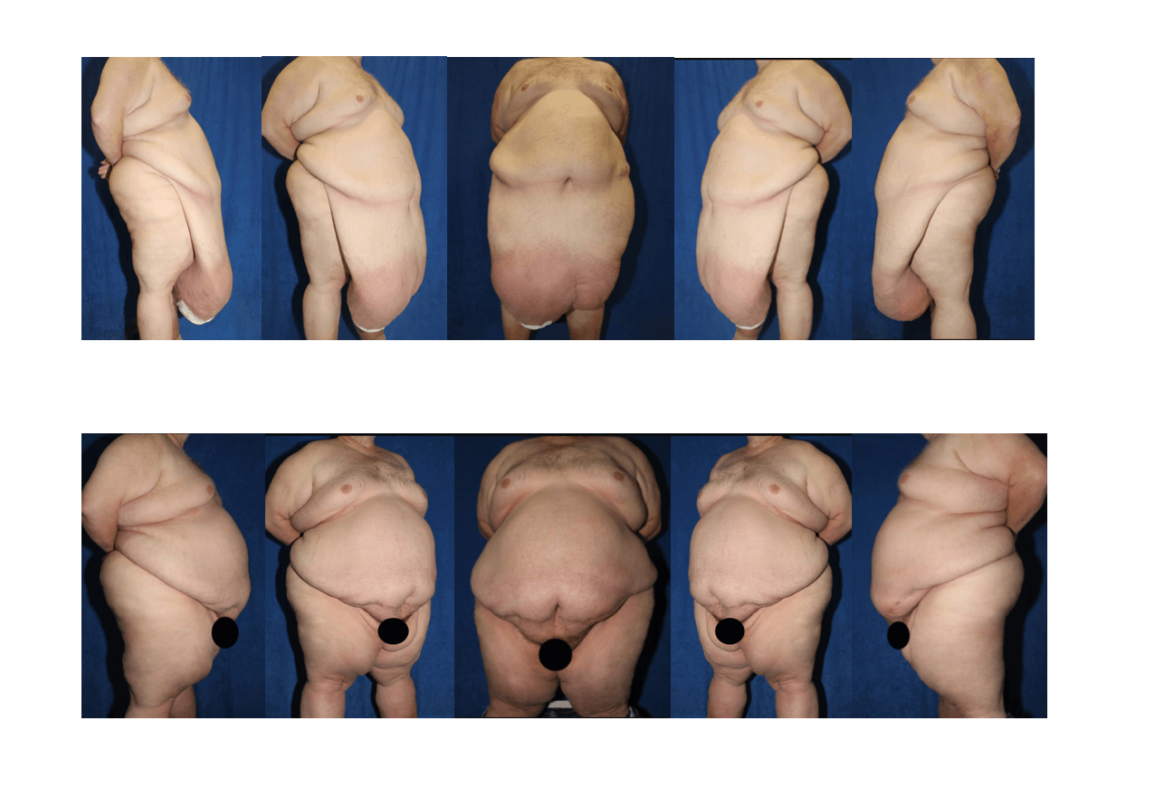 Figure #7: These 10 pictures showcase a 47 year male patient who weighed 450 pounds, underwent gastric bypass, and lost an incredible 160 pounds. Despite his significant weight loss, he was still unhappy with the excess skin and fat in his abdomen. To address his concerns, he underwent a panniculectomy and abdominoplasty. During this procedure, a staggering 20 pounds was removed from the patient's abdomen. After the procedure, the patient felt much lighter and more comfortable, allowing him to move around with greater ease. He was delighted with the results and grateful for the life-changing transformation.