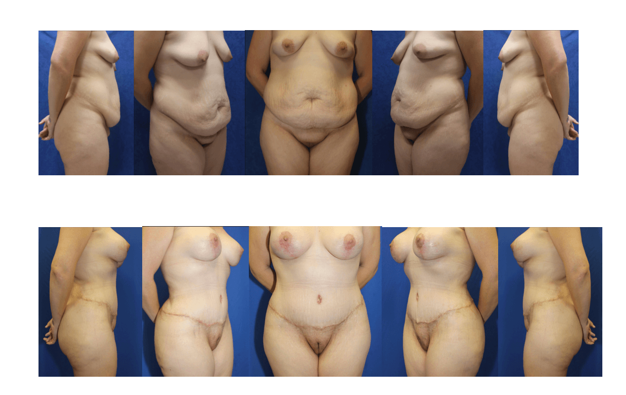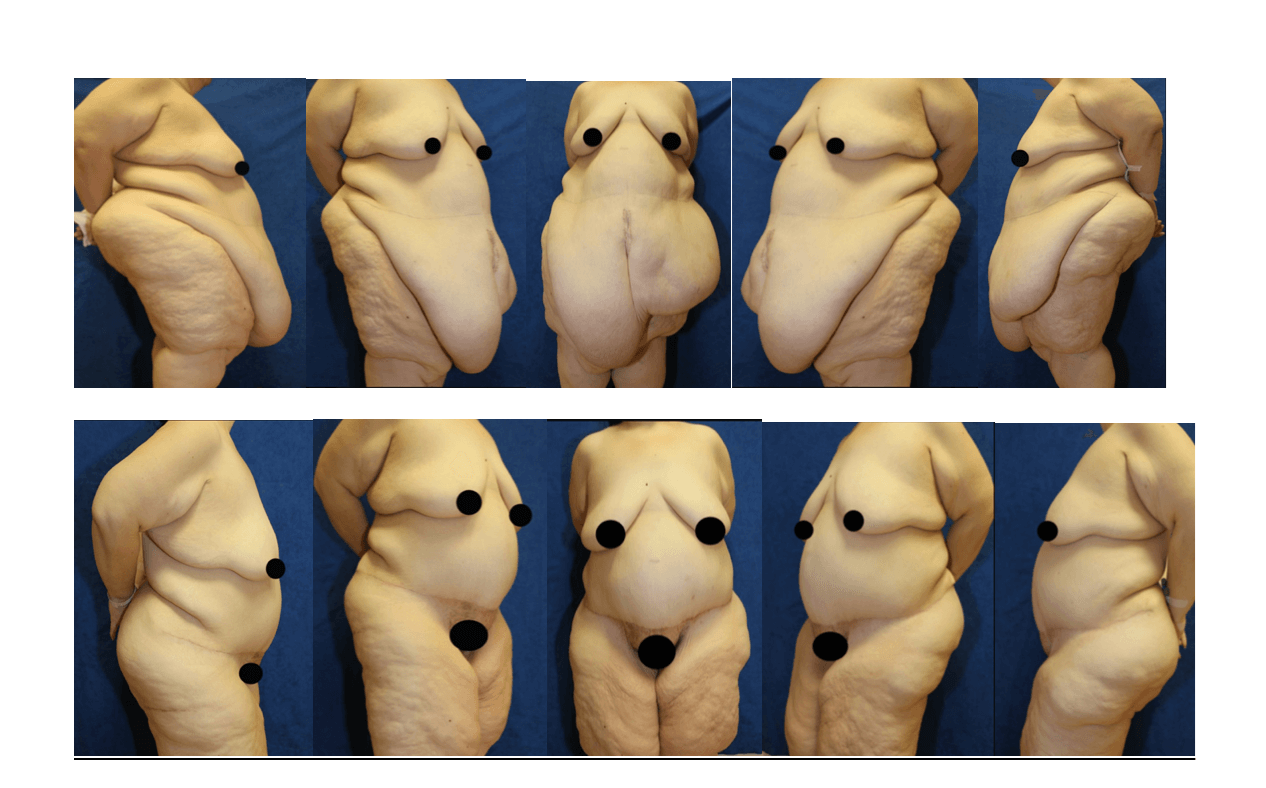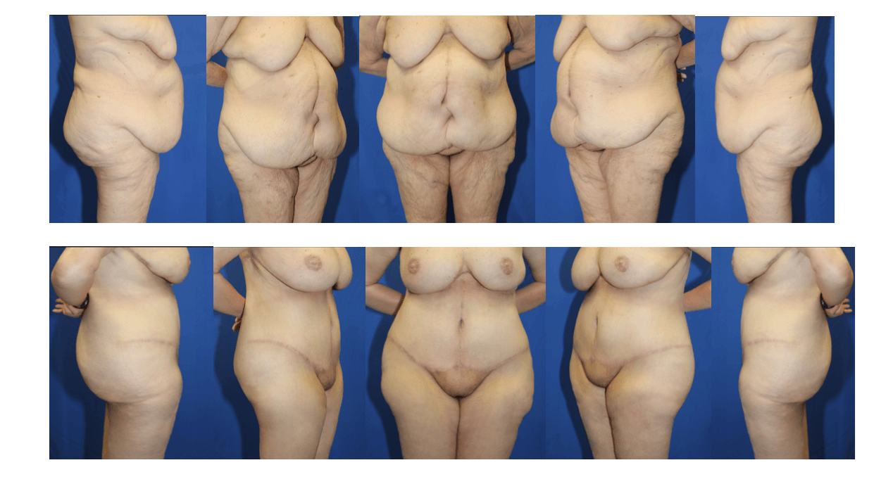 Figure #5: These 10 before and after pictures depict a 47-year-old White female who stood at 5'5" and weighed 341 pounds. She underwent a gastric sleeve and lost 133 pounds. However, she was still struggling with excess skin and fat in various areas of her body, including her abdomen, hips, legs, and buttocks. She underwent a panniculectomy and 360 circumferential lower body lift. With this procedure, 34 pounds of excess skin and fat was removed. Now, our patient is thrilled with her new body and feels more confident than ever before. Her transformation is a shining example of how hard work, determination, and the expertise of a skilled surgeon can help achieve life-changing results.