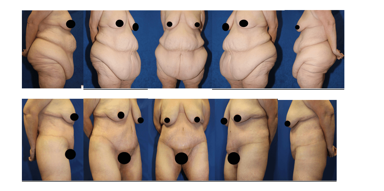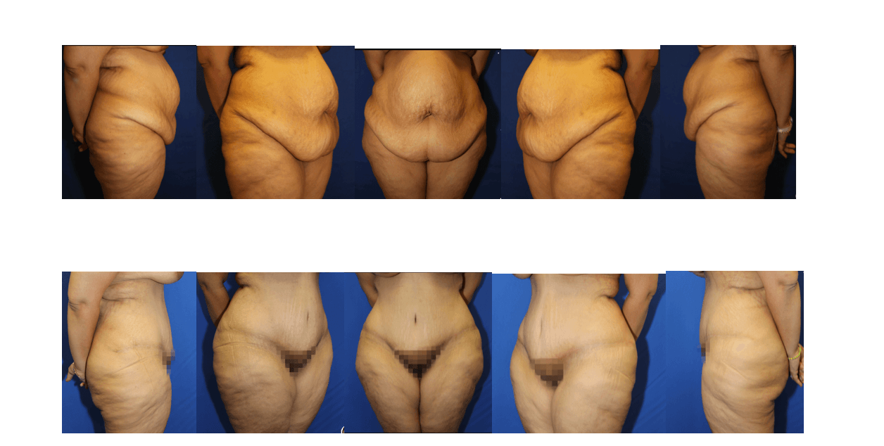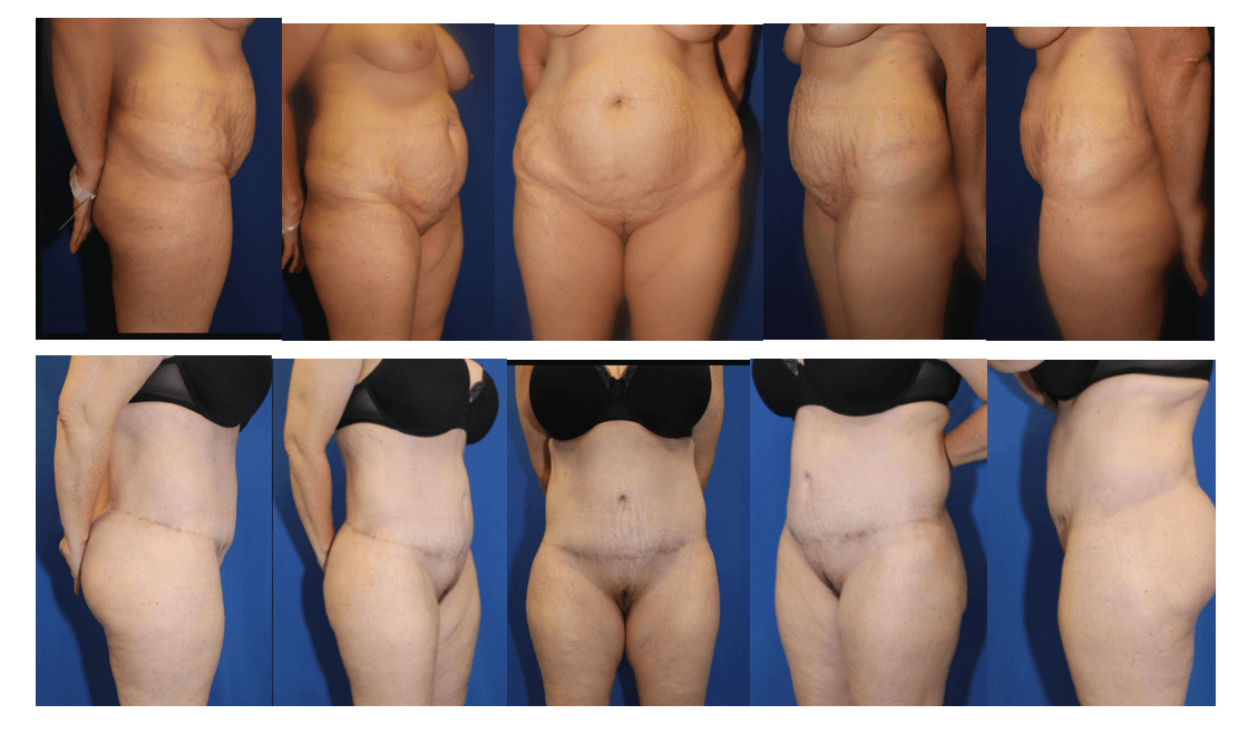 Figure #4: This set of 10 pictures show the before and after pictures of a 34 year old female patient who weighed 260 pounds and lost 90 pounds. She was not happy with the excess skin and fat in her abdomen. She underwent a tummy tuck. She is extremely satisfied with her results.