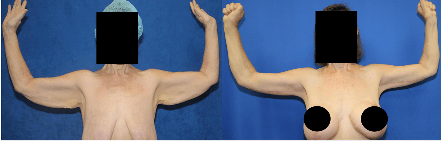This 60-year-old female patient is 128 lbs, and stands at a height of 5’4. She chose to undergo an arm lift and reduction as well as a breast lift with augmentation.